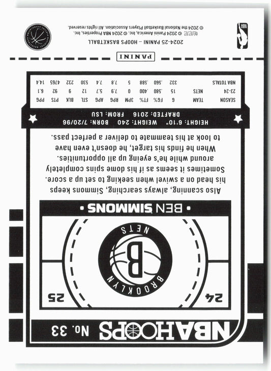 This is a nice example of a 2024-25 Hoops #33 Ben Simmons Other important information about this card:In 2024 Ben Simmons played for the Brooklyn Nets.Please check out our other...