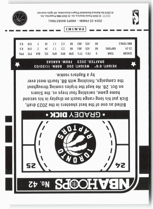 This is a nice example of a 2024-25 Hoops #42 Gradey Dick Other important information about this card:In 2024 Gradey Dick played for the Toronto Raptors.Please check out our other...