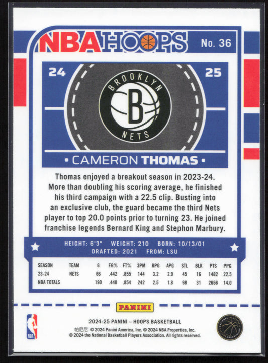 This is a nice example of a 2024-25 Hoops #36 Cameron Thomas Premium Other important information about this card:In 2024 Cameron Thomas played for the Brooklyn Nets.Please check out our...