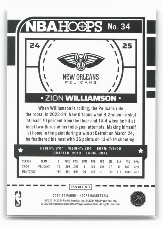 This is a nice example of a 2024-25 Hoops #34 Zion Williamson Other important information about this card:In 2024 Zion Williamson played for the New Orleans Pelicans.Please check out our...