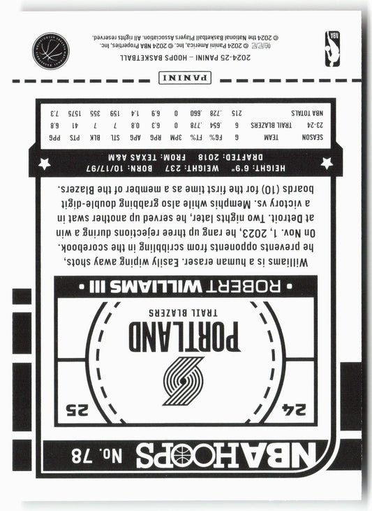 This is a nice example of a 2024-25 Hoops #78 Robert Williams III Other important information about this card:Gooden In Action;In 2024 Robert Williams III played for the Portland Trail...