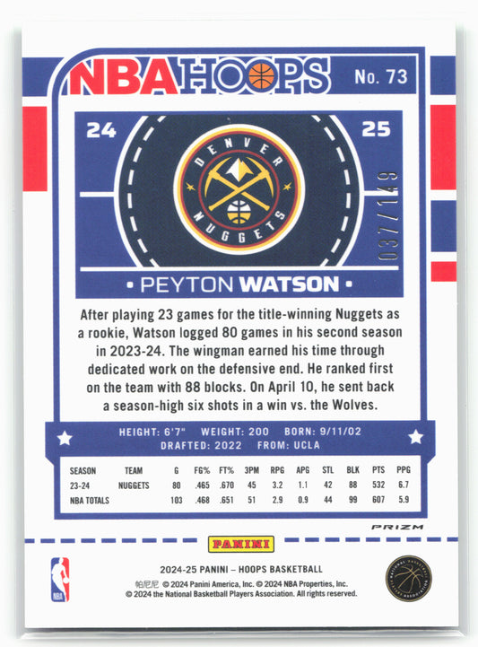 This is a nice example of a 2024-25 Hoops #73 Peyton Watson Premium Prizms Lime Green Other important information about this card:SNIn 2024 Peyton Watson played for the Denver Nuggets.Please...