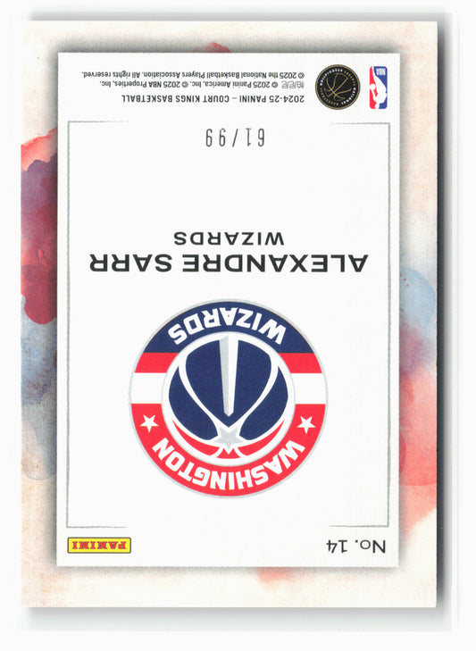 This is a nice example of a 2024-25 Panini Court Kings #14 Alexandre Sarr Water Color Pink Other important information about this card:SNIn 2024 Alexandre Sarr played for the Washington...