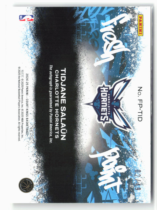 This is a nice example of a 2024-25 Panini Court Kings #FP-TID Tidjane Salaun Fresh Paint Violet Other important information about this card:SN,AUIn 2024 Tidjane Salaun played for the Charlotte...