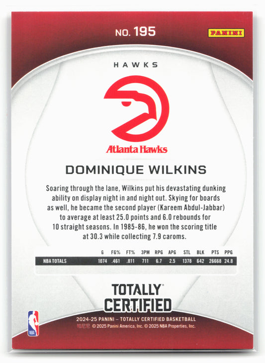 This is a nice example of a 2024-25 Panini Totally Certified #195 Dominique Wilkins Other important information about this card:In 2024 Dominique Wilkins played for the Atlanta Hawks.Please check out...