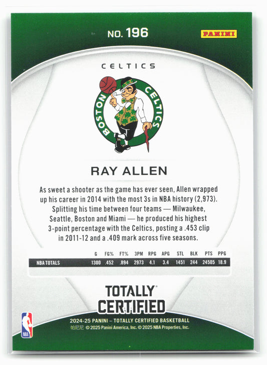 This is a nice example of a 2024-25 Panini Totally Certified #196 Ray Allen Other important information about this card:18398In 2024 Ray Allen played for the Boston Celtics.Please check out...