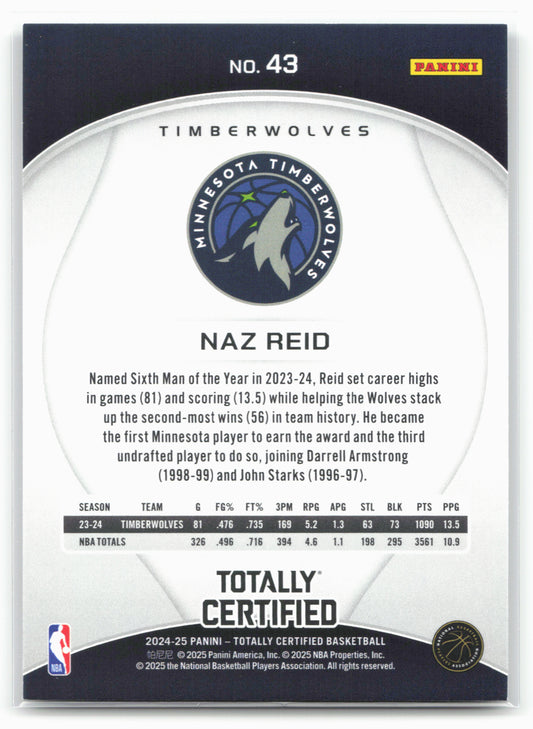 This is a nice example of a 2024-25 Panini Totally Certified #43 Naz Reid Other important information about this card:18390In 2024 Naz Reid played for the Minnesota Timberwolves.Please check out...