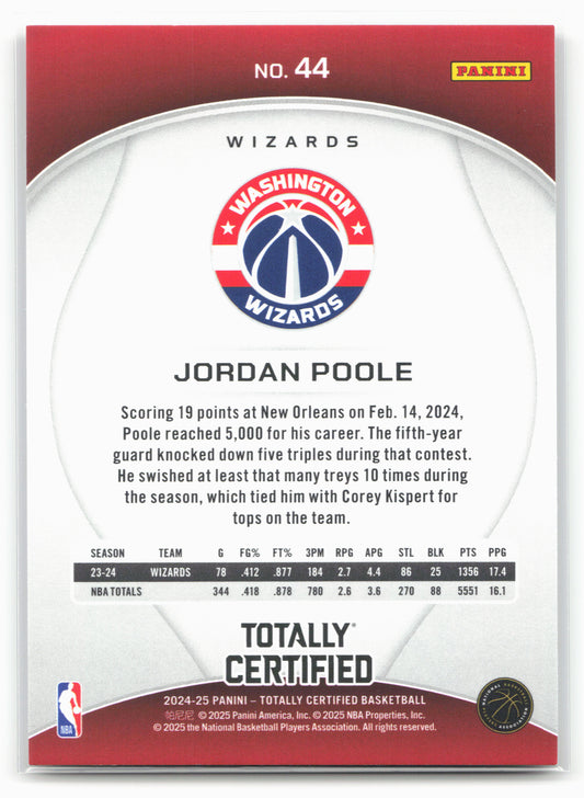 This is a nice example of a 2024-25 Panini Totally Certified #44 Jordan Poole Other important information about this card:18410In 2024 Jordan Poole played for the Washington Wizards.Please check out...