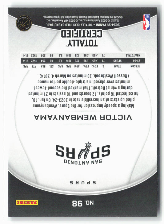 This is a nice example of a 2024-25 Panini Totally Certified #98 Victor Wembanyama Other important information about this card:In 2024 Victor Wembanyama played for the San Antonio Spurs.Please check...