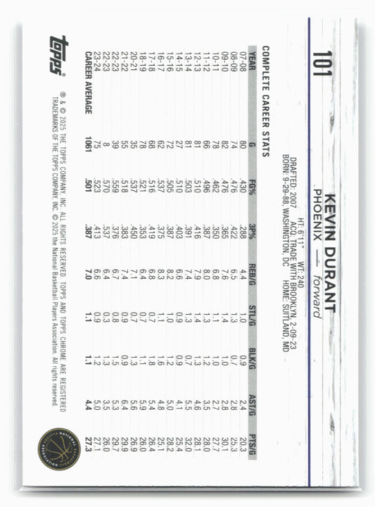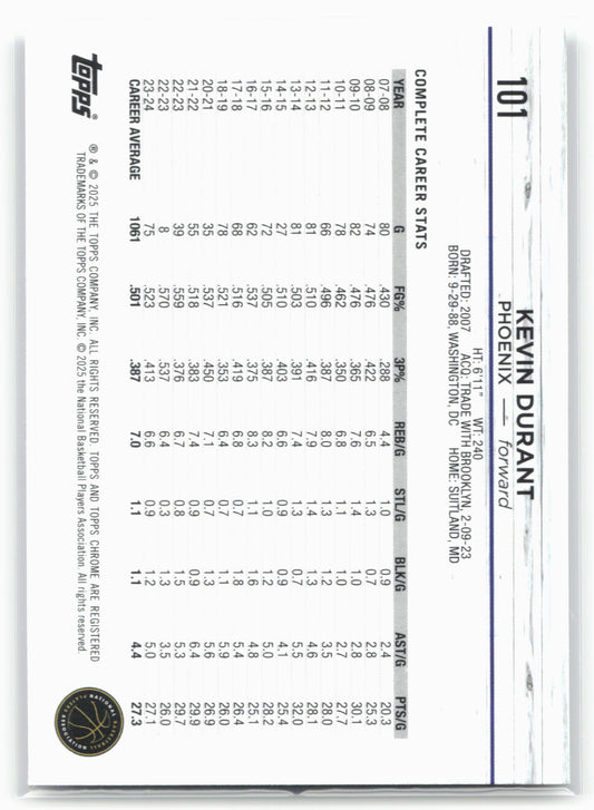 This is a nice example of a 2024-25 Topps Chrome #101 Kevin Durant Other important information about this card:In 2024 Kevin Durant played for the Phoenix Suns.Please check out our...