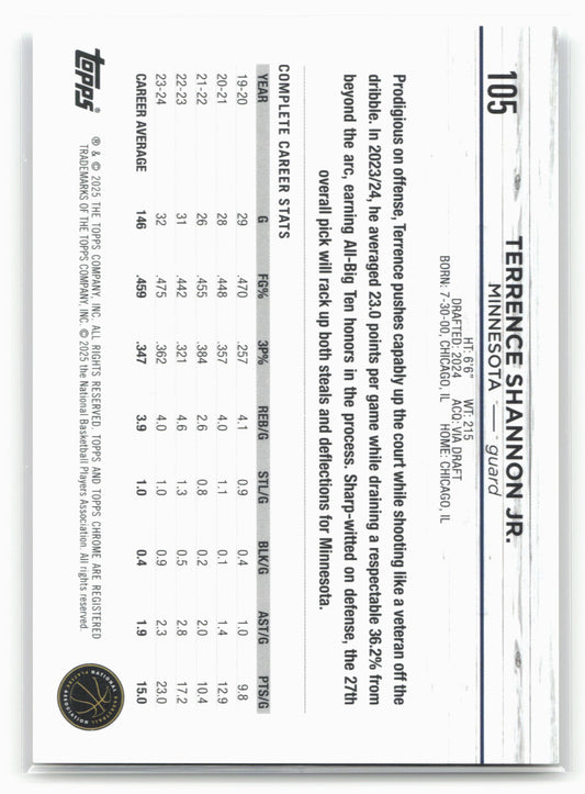 This is a nice example of a 2024-25 Topps Chrome #105 Terrence Shannon Jr. Gold Refractor Other important information about this card:SN,RCIn 2024 Terrence Shannon Jr. played for the Minnesota...