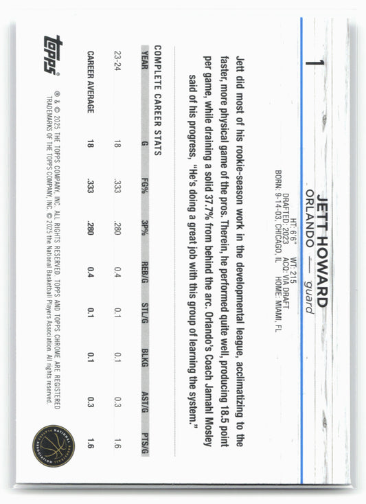 This is a nice example of a 2024-25 Topps Chrome #1 Jett Howard Blue Basketball Refractor Other important information about this card:19512In 2024 Jett Howard played for the Orlando Magic.Please...