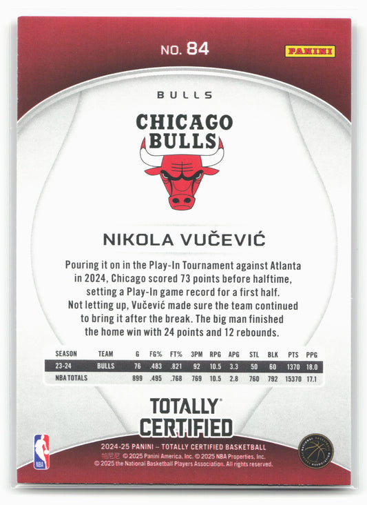 This is a nice example of a 2024-25 Panini Totally Certified #84 Nikola Vucevic Mirror Maroon Other important information about this card:In 2024 Nikola Vucevic played for the Chicago Bulls.Please...