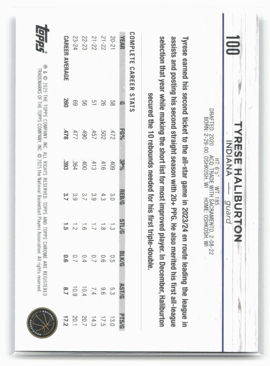 This is a nice example of a 2024-25 Topps Chrome #100 Tyrese Haliburton Blue Basketball Refractor Other important information about this card:In 2024 Tyrese Haliburton played for the Indiana Pacers.Please...