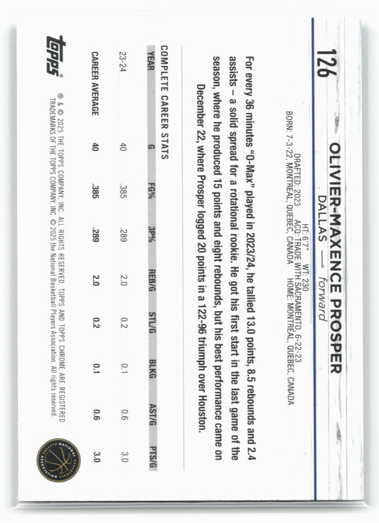 This is a nice example of a 2024-25 Topps Chrome #126 Olivier-Maxence Prosper Other important information about this card:In 2024 Olivier-Maxence Prosper played for the Dallas Mavericks.Please check out our...