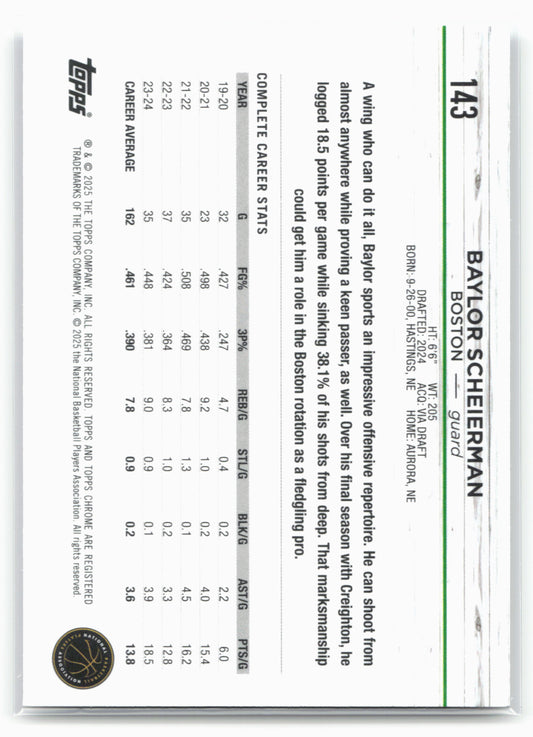 This is a nice example of a 2024-25 Topps Chrome #143 Baylor Scheierman Other important information about this card:RCIn 2024 Baylor Scheierman played for the Boston Celtics.Please check out our...
