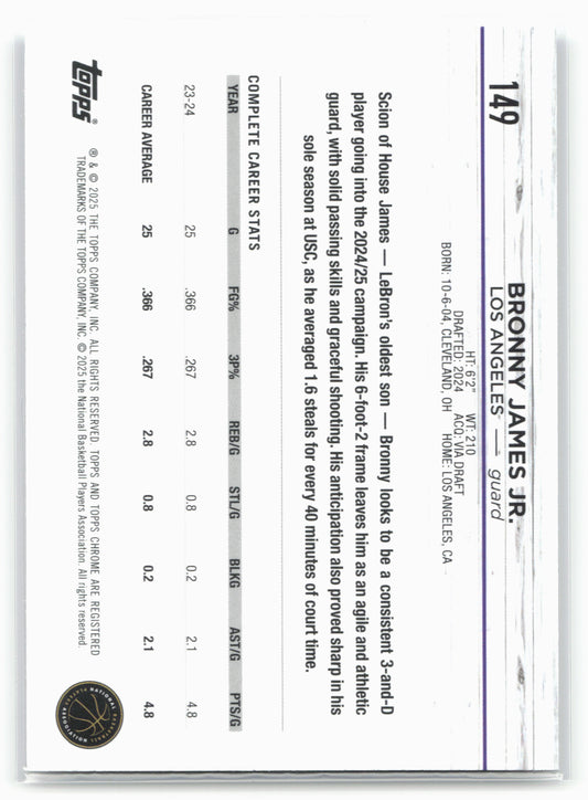 This is a nice example of a 2024-25 Topps Chrome #149 Bronny James Jr. Other important information about this card:RCIn 2024 Bronny James Jr. played for the Los Angeles Lakers.Please...
