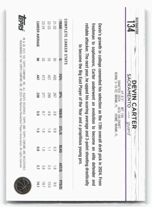 This is a nice example of a 2024-25 Topps Chrome #134 Devin Carter Refractor Other important information about this card:RCIn 2024 Devin Carter played for the Sacramento Kings.Please check out...