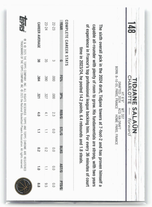 This is a nice example of a 2024-25 Topps Chrome #148 Tidjane Salaün Other important information about this card:RCIn 2024 Tidjane Salaün played for the Charlotte Hornets.Please check out our...