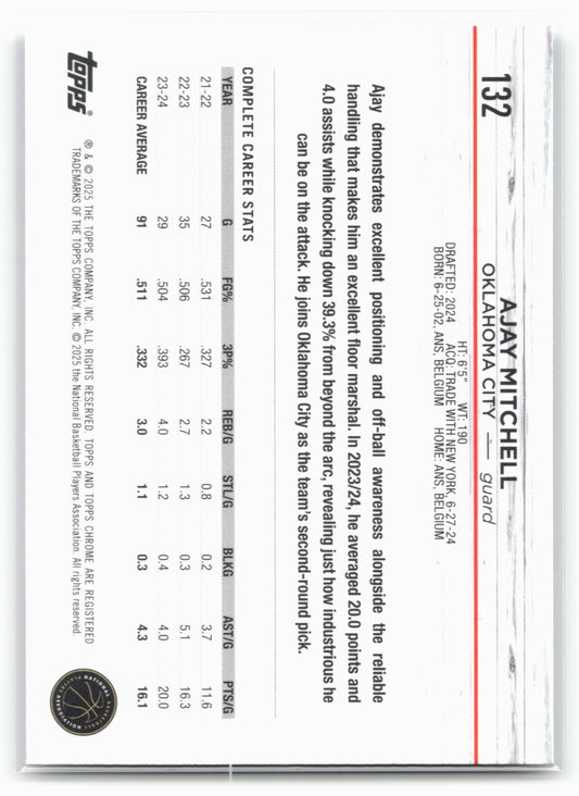This is a nice example of a 2024-25 Topps Chrome #132 Ajay Mitchell Other important information about this card:RCIn 2024 Ajay Mitchell played for the Oklahoma City Thunder.Please check out...