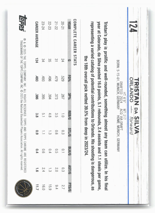 This is a nice example of a 2024-25 Topps Chrome #124 Tristan da Silva Magenta Refractor Other important information about this card:RCIn 2024 Tristan da Silva played for the Orlando...