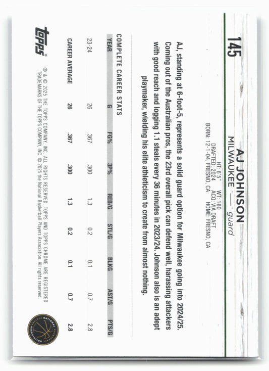 This is a nice example of a 2024-25 Topps Chrome #145 AJ Johnson Other important information about this card:RCIn 2024 AJ Johnson played for the Milwaukee Bucks.Please check out our...