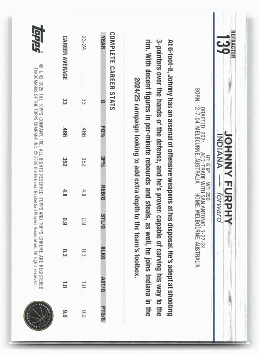 This is a nice example of a 2024-25 Topps Chrome #139 Johnny Furphy Refractor Other important information about this card:RCIn 2024 Johnny Furphy played for the Indiana Pacers.Please check out...