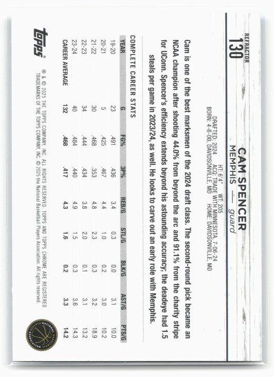 This is a nice example of a 2024-25 Topps Chrome #130 Cam Spencer Refractor Other important information about this card:19211RCIn 2024 Cam Spencer played for the Memphis Grizzlies.Please check out...