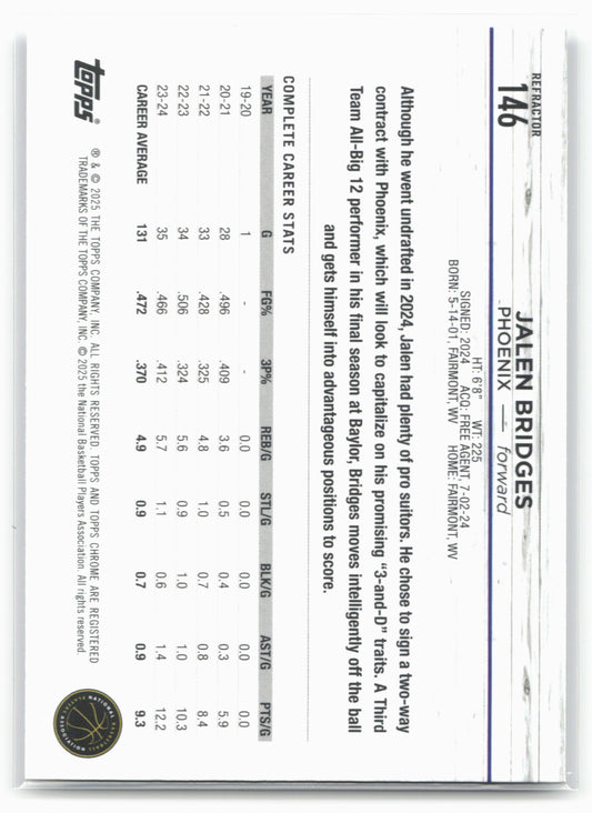 This is a nice example of a 2024-25 Topps Chrome #146 Jalen Bridges Refractor Other important information about this card:19235RCIn 2024 Jalen Bridges played for the Phoenix Suns.Please check out...