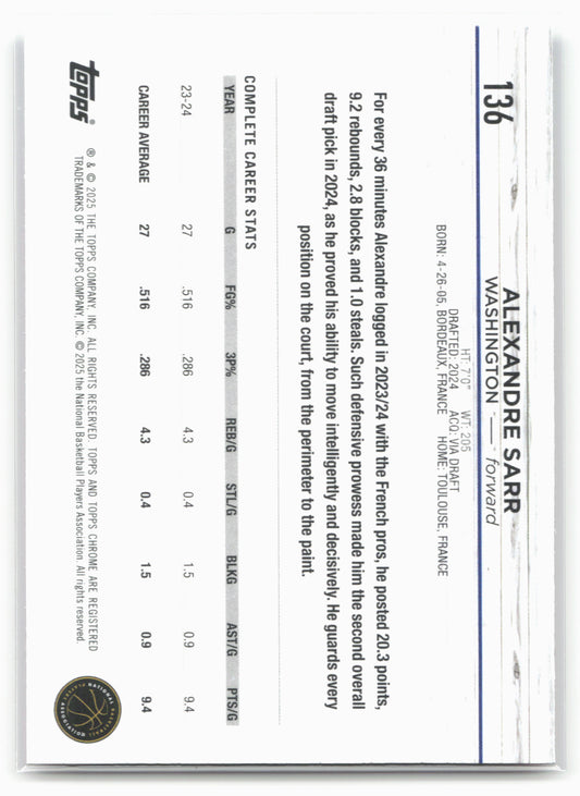 This is a nice example of a 2024-25 Topps Chrome #136 Alexandre Sarr Magenta Refractor Other important information about this card:19246RCIn 2024 Alexandre Sarr played for the Washington Wizards.Please check...
