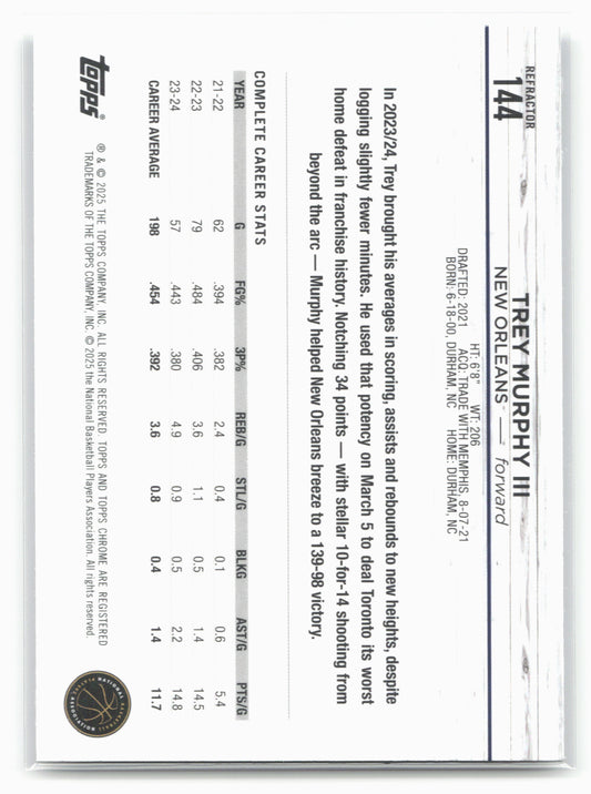 This is a nice example of a 2024-25 Topps Chrome #144 Trey Murphy III Refractor Other important information about this card:19247In 2024 Trey Murphy III played for the New Orleans...