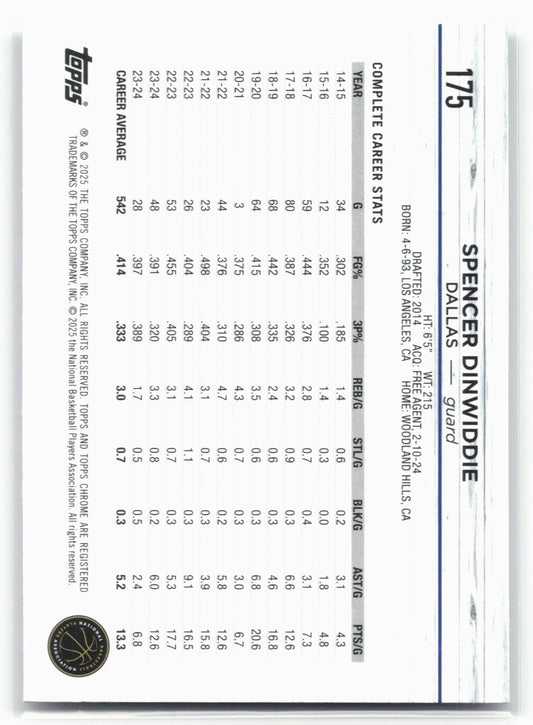 This is a nice example of a 2024-25 Topps Chrome #175 Spencer Dinwiddie Other important information about this card:In 2024 Spencer Dinwiddie played for the Dallas Mavericks.Please check out our...