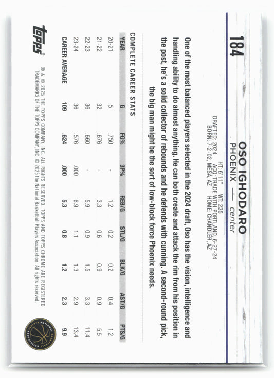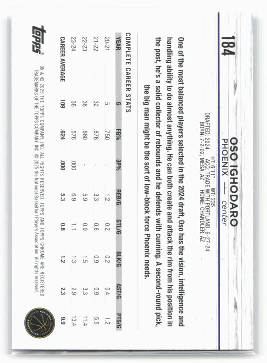 This is a nice example of a 2024-25 Topps Chrome #184 Oso Ighodaro Other important information about this card:RCIn 2024 Oso Ighodaro played for the Phoenix Suns.Please check out our...