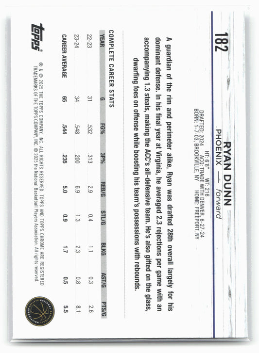 This is a nice example of a 2024-25 Topps Chrome #182 Ryan Dunn Other important information about this card:RCIn 2024 Ryan Dunn played for the Phoenix Suns.Please check out our...