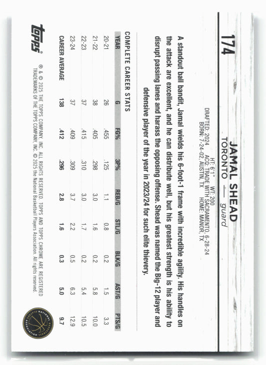 This is a nice example of a 2024-25 Topps Chrome #174 Jamal Shead Topps Green Refractor Other important information about this card:RCIn 2024 Jamal Shead played for the Toronto Raptors.Please...
