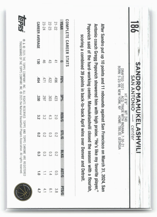 This is a nice example of a 2024-25 Topps Chrome #186 Sandro Mamukelashvili Other important information about this card:In 2024 Sandro Mamukelashvili played for the San Antonio Spurs.Please check out...