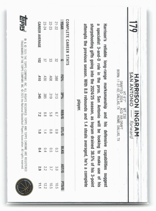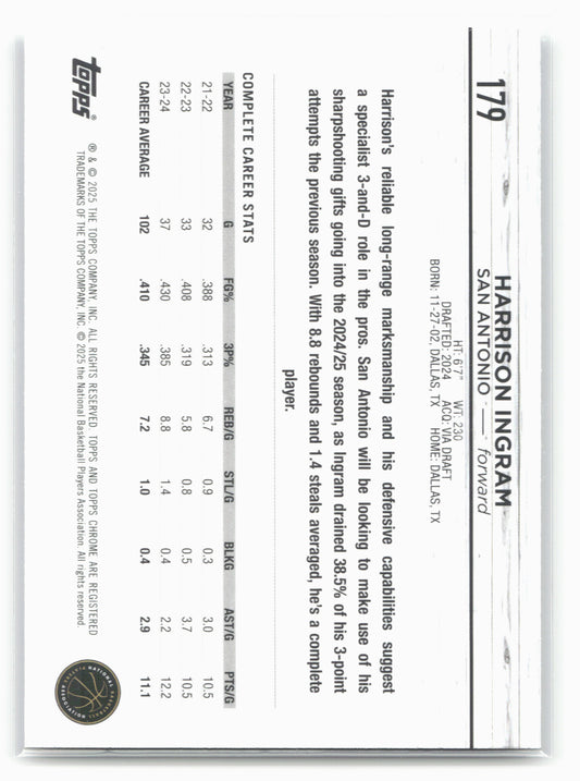 This is a nice example of a 2024-25 Topps Chrome #179 Harrison Ingram Other important information about this card:RCIn 2024 Harrison Ingram played for the San Antonio Spurs.Please check out...