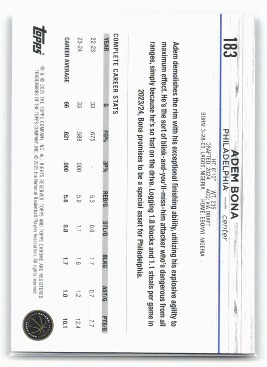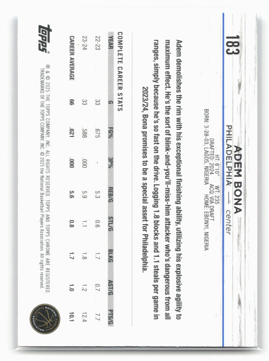 This is a nice example of a 2024-25 Topps Chrome #183 Adem Bona Other important information about this card:RCIn 2024 Adem Bona played for the Philadelphia 76ers.Please check out our...