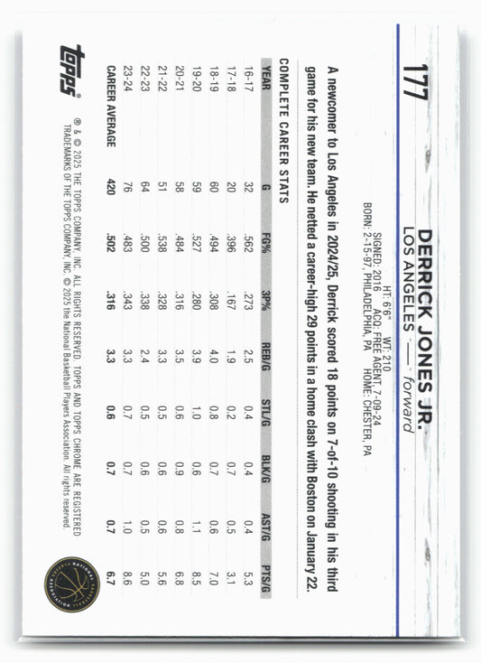 This is a nice example of a 2024-25 Topps Chrome #177 Derrick Jones Jr. Other important information about this card:In 2024 Derrick Jones Jr. played for the Los Angeles Clippers.Please...