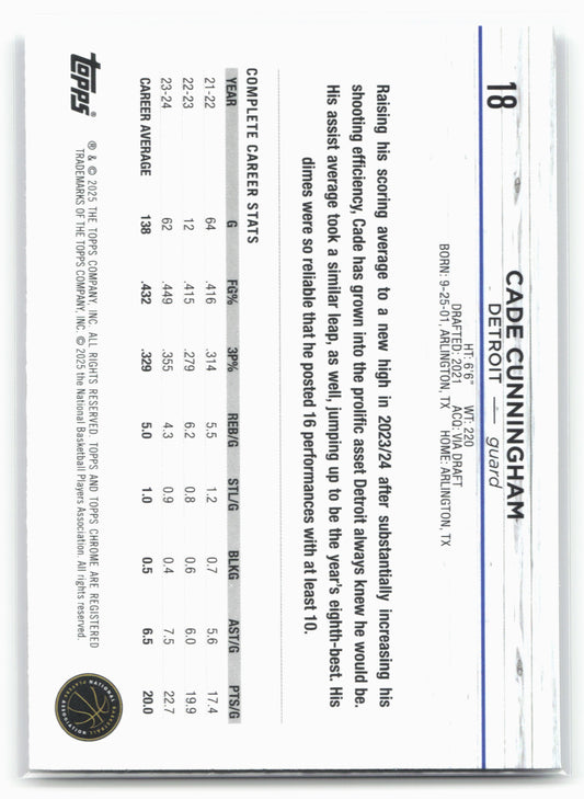 This is a nice example of a 2024-25 Topps Chrome #18 Cade Cunningham Other important information about this card:In 2024 Cade Cunningham played for the Detroit Pistons.Please check out our...