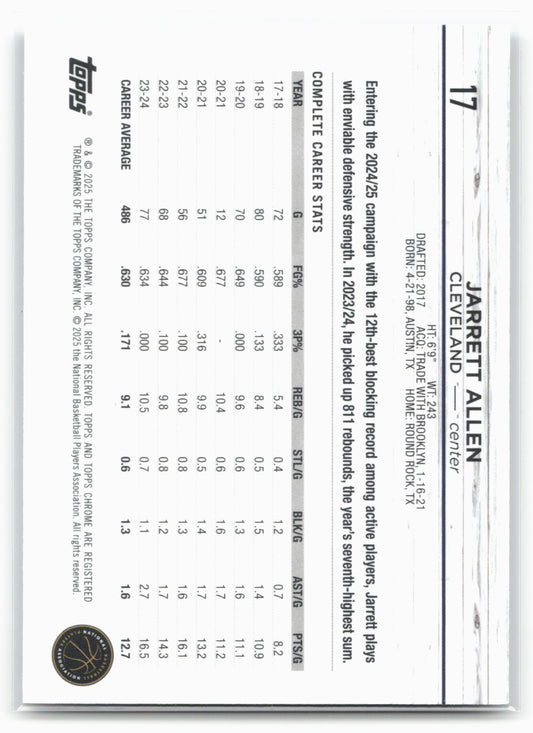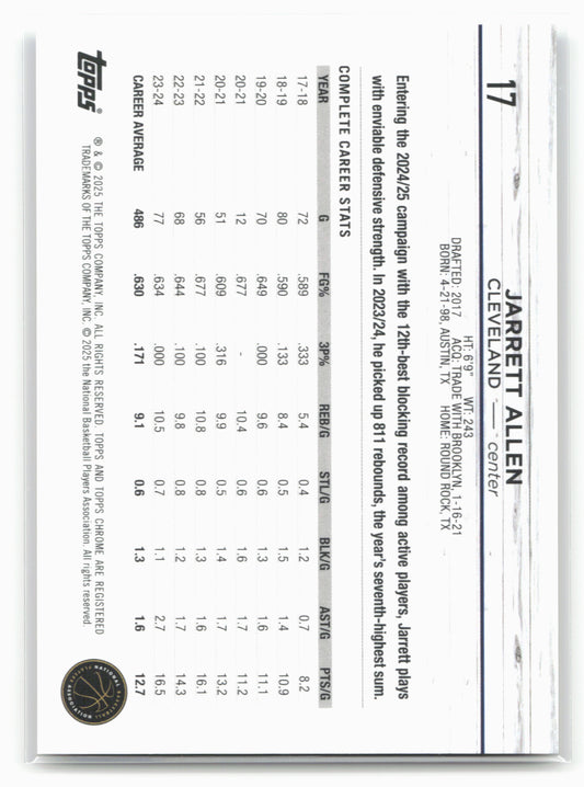 This is a nice example of a 2024-25 Topps Chrome #17 Jarrett Allen Other important information about this card:In 2024 Jarrett Allen played for the Cleveland Cavaliers.Please check out our...