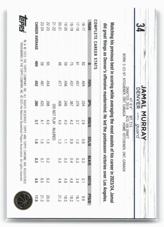 This is a nice example of a 2024-25 Topps Chrome #34 Jamal Murray Purple Sonar Refractor Other important information about this card:SNIn 2024 Jamal Murray played for the Denver Nuggets.Please...
