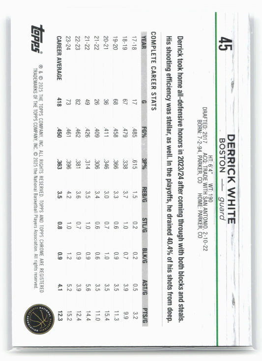 This is a nice example of a 2024-25 Topps Chrome #45 Derrick White Other important information about this card:In 2024 Derrick White played for the Boston Celtics.Please check out our...
