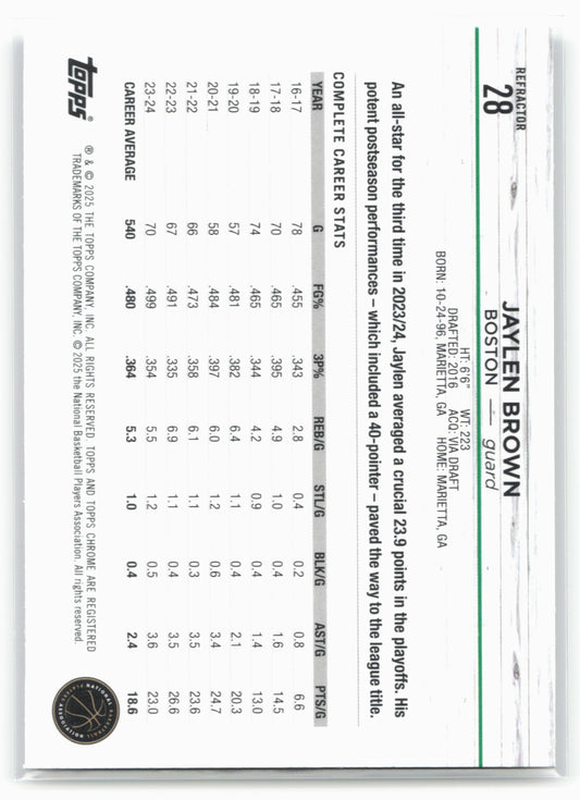 This is a nice example of a 2024-25 Topps Chrome #28 Jaylen Brown Refractor Other important information about this card:In 2024 Jaylen Brown played for the Boston Celtics.Please check out...