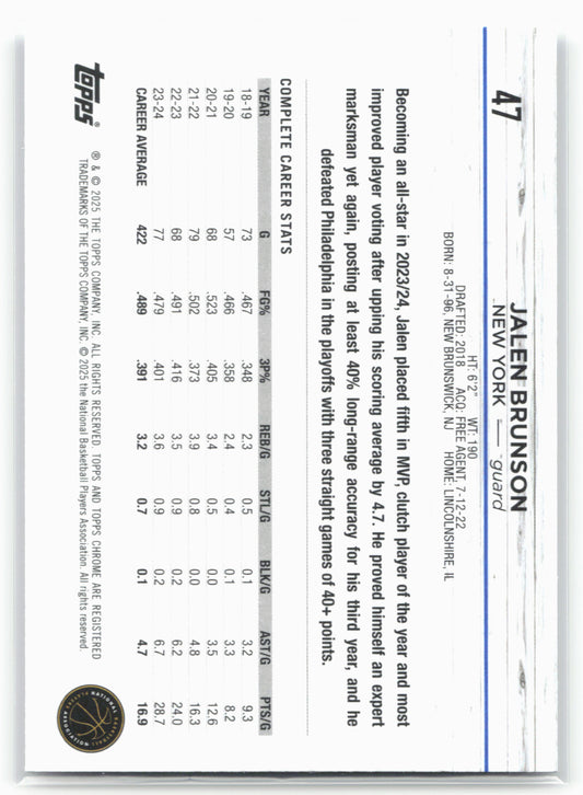 This is a nice example of a 2024-25 Topps Chrome #47 Jalen Brunson Other important information about this card:In 2024 Jalen Brunson played for the New York Knicks.Please check out...