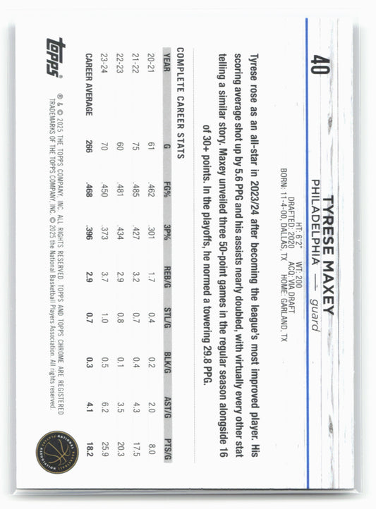 This is a nice example of a 2024-25 Topps Chrome #40 Tyrese Maxey Other important information about this card:In 2024 Tyrese Maxey played for the Philadelphia 76ers.Please check out our...