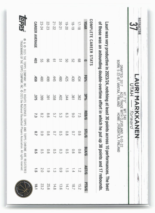 This is a nice example of a 2024-25 Topps Chrome #37 Lauri Markkanen Refractor Other important information about this card:In 2024 Lauri Markkanen played for the Utah Jazz.Please check out...