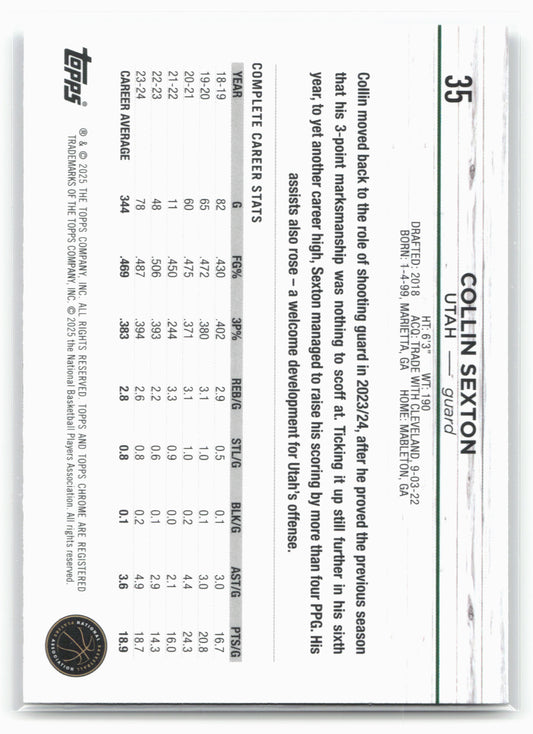 This is a nice example of a 2024-25 Topps Chrome #35 Collin Sexton Other important information about this card:In 2024 Collin Sexton played for the Utah Jazz.Please check out our...
