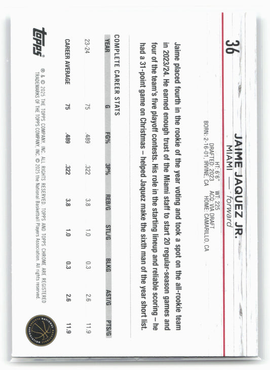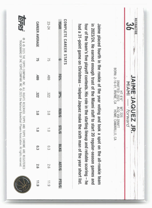 This is a nice example of a 2024-25 Topps Chrome #36 Jaime Jaquez Jr. Refractor Other important information about this card:In 2024 Jaime Jaquez Jr. played for the Miami Heat.Please...