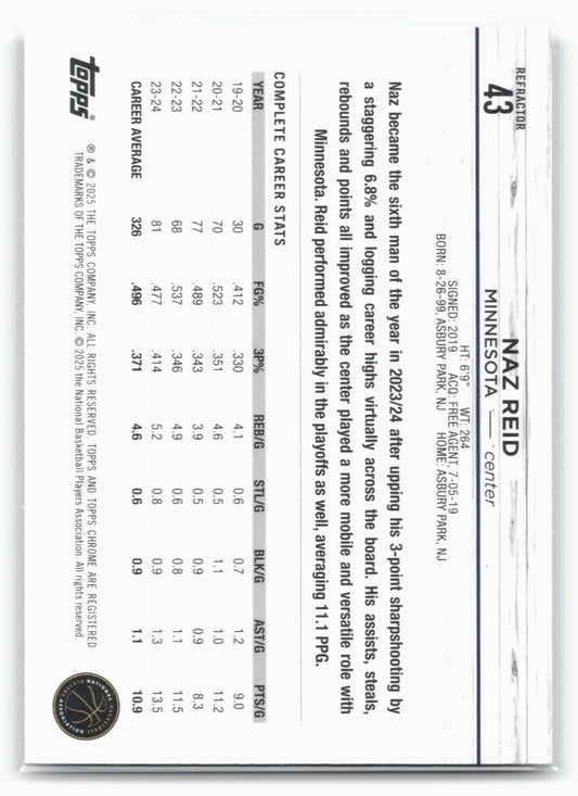 This is a nice example of a 2024-25 Topps Chrome #43 Naz Reid Refractor Other important information about this card:In 2024 Naz Reid played for the Minnesota Timberwolves.Please check out...